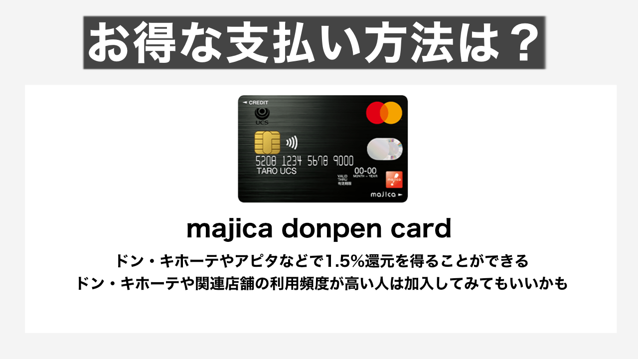 majica donpen cardはドン・キホーテやアピタなどで1.5%還元を得ることができるカード。ドン・キホーテでは特に還元率がアップするカードがないので、その中では比較的高い還元率を得ることが可能だ。